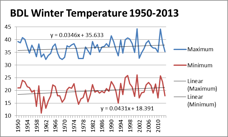 Global average temperature is a computed value without much direct influence on the local environment. In order to determine its effect on Connecticut, data was obtained from The National Climatic Center and updated to 2014.