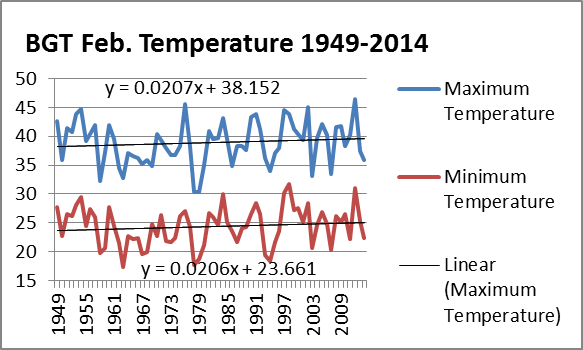 The temperature at Bridgeport for February is shown in the next figure. While trend lines are presented in the graphs, their correlation is very low and is near .01. Thus they have little predictable capability. For example, the record cold of 2015 with temperature of 11.0 and 29.1 were not able to be predicted by the chart. And if they were included on the chart, the trends would result in cooling trends for Connecticut.